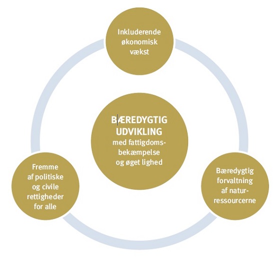 Der er klare forbindelser mellem de tre strategiske områder. En inkluderende og bæredygtig økonomisk vækst vil bidrage til at skabe flere og bedre arbejdspladser og dermed bidrage direkte til fattigdomsbekæmpelse. Derudover vil den bidrage til at øge den offentlige sektors indtægter og dermed støtte regeringens politik til fordel for et fortsat øget niveau af offentlige investeringer og ydelser, såsom uddannelse, sundhed, vand, infrastruktur mv. til gavn for dem, der lever i fattigdom eller i områder, hvor sådanne ydelser i øjeblikket ikke leveres, særligt oprindelige folk.