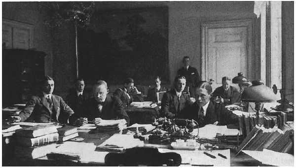 Billedet her viser det samlede personale for Udenrigsministeriet i februar 1928 ved samling til ære for de i ministeriet, der skulle udsendes senere på året. Personalet omfatter direktøren Eduard Reventlow (1. række, nr. 3 fra højre), kontorcheferne, de fuldmægtige og sekretærerne. De fleste på billedet indtog senere ledende poster i ministeriet og på gesandtskaberne/ambassaderne. Foto: Udenrigsministeriet