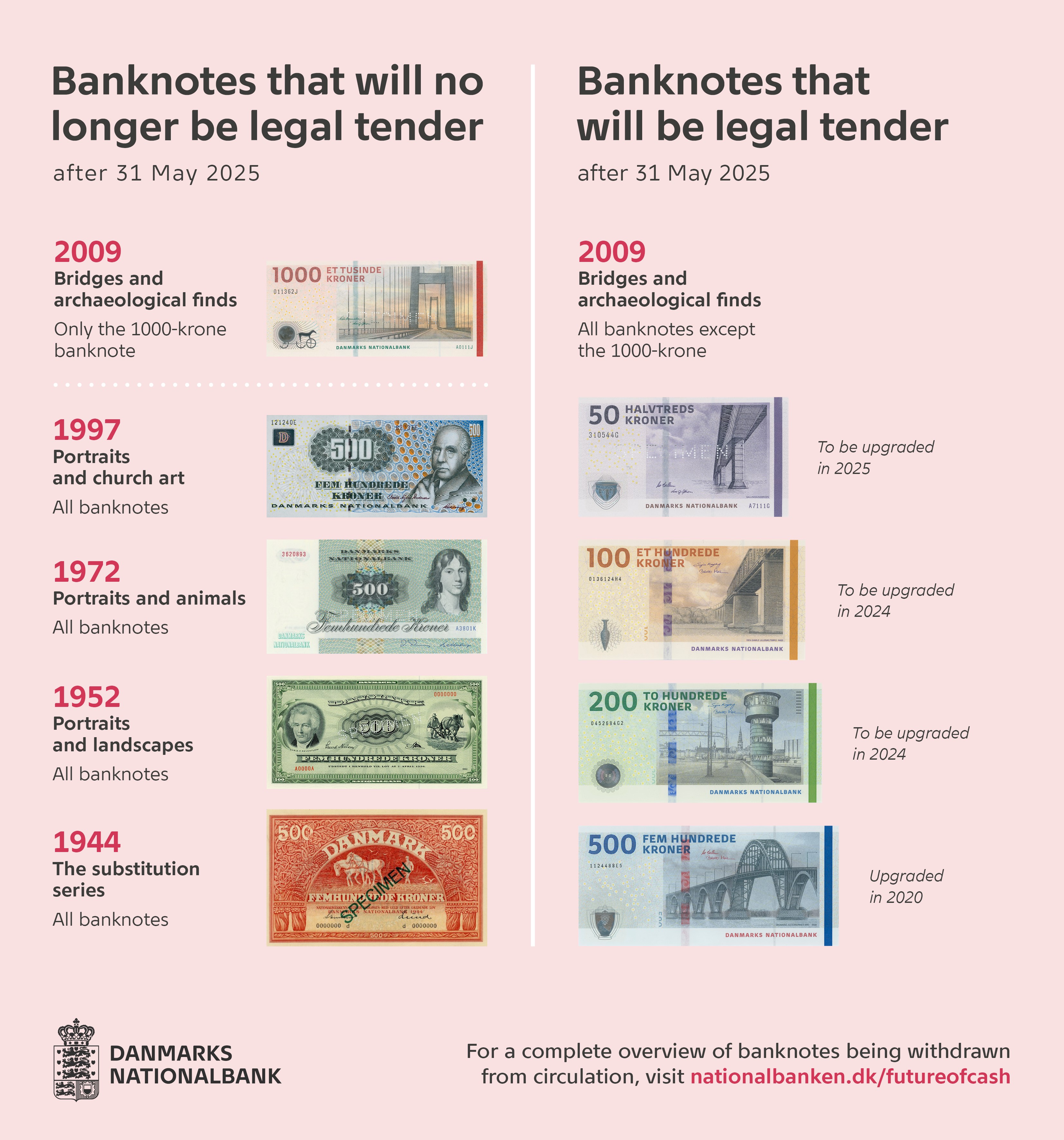 All older Danish banknotes and the current Danish 1000-krone banknote will no longer be legal tender after 31 May 2025.