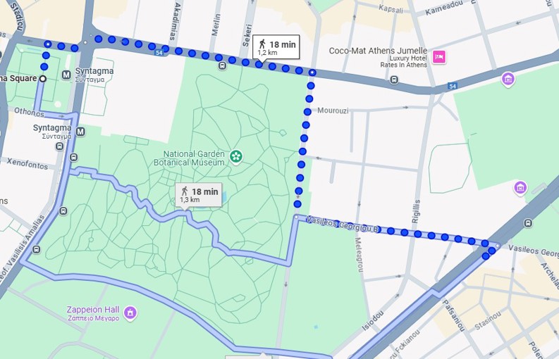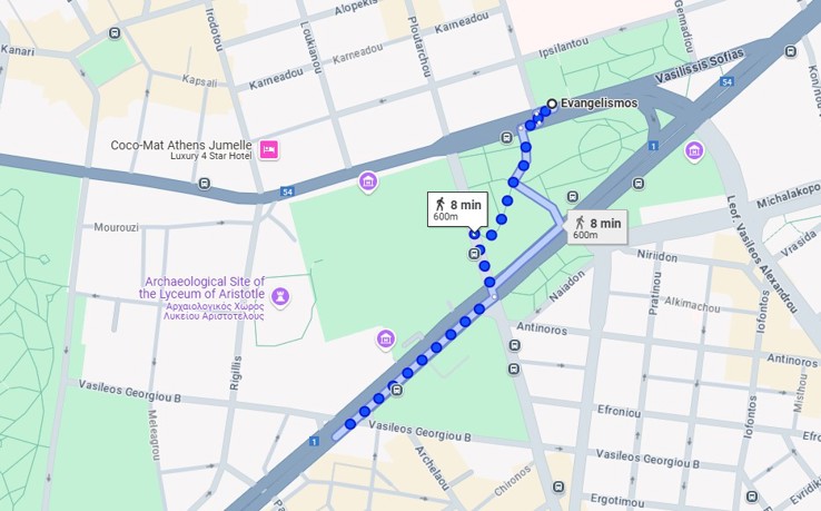 Rutevejledning til ambassaden fra Evangelismos Metro