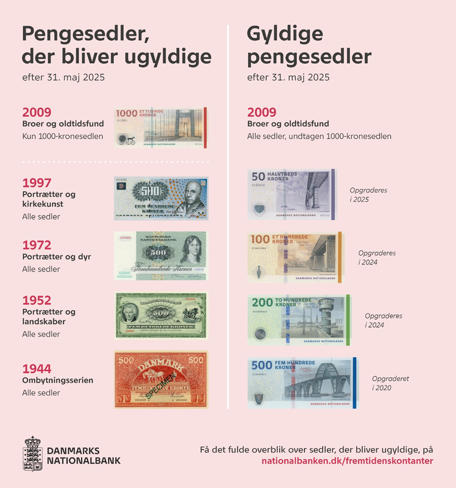 Danish banknotes issued before 2009 and 1000-DKK banknotes will become invalid pr. 31 May 2025.