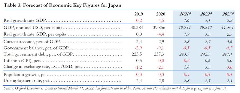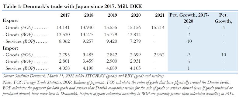 - Imports of goods from Japan totalled DKK 3,0 billion in 2021; a rise of 9,7% relative to 2020.(FOS)