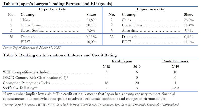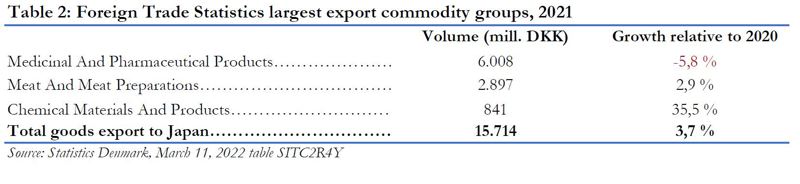 - Japan was Denmark's 15th largest export market in 2020, totalling DKK 21,1 billion in revenues which accounted for 1,6% of danish exports. (BOP)