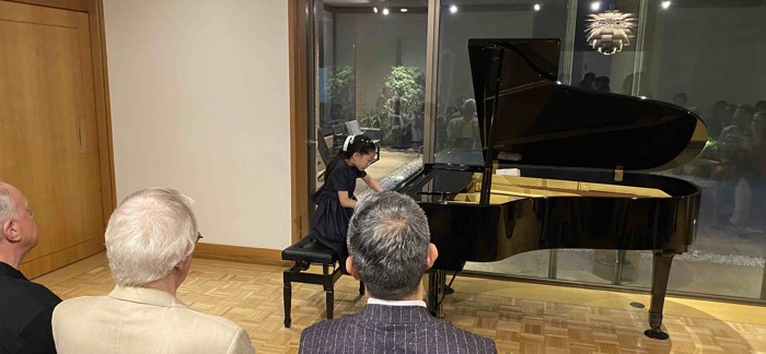 The residence was opened to a piano performance by 12-year old Japanese, Yuri Yasui, who enchanted everybody with her outstanding piano skills. Yuri Yasui contacted the embassy herself about a performance at the embassy, as she had fallen in love with Denmark, when she in March participated in the Århus International Piano Competition 2023. In the courtyard, there were also multiple live jazz performances that helped create the festive atmosphere of the night.