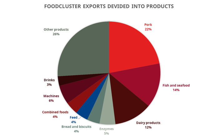 The Danish food cluster is a large sector, which produces and exports many different products. In 2020 the three main products that accounted for the largest parts of exports was pork with 22 pct, fish and seafood with 14 pct., and dairy products with 12 pct.