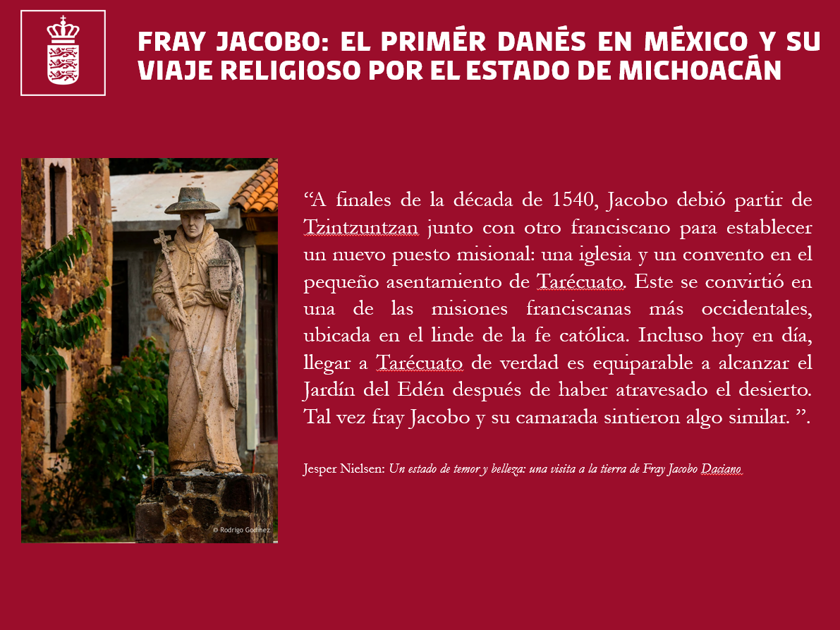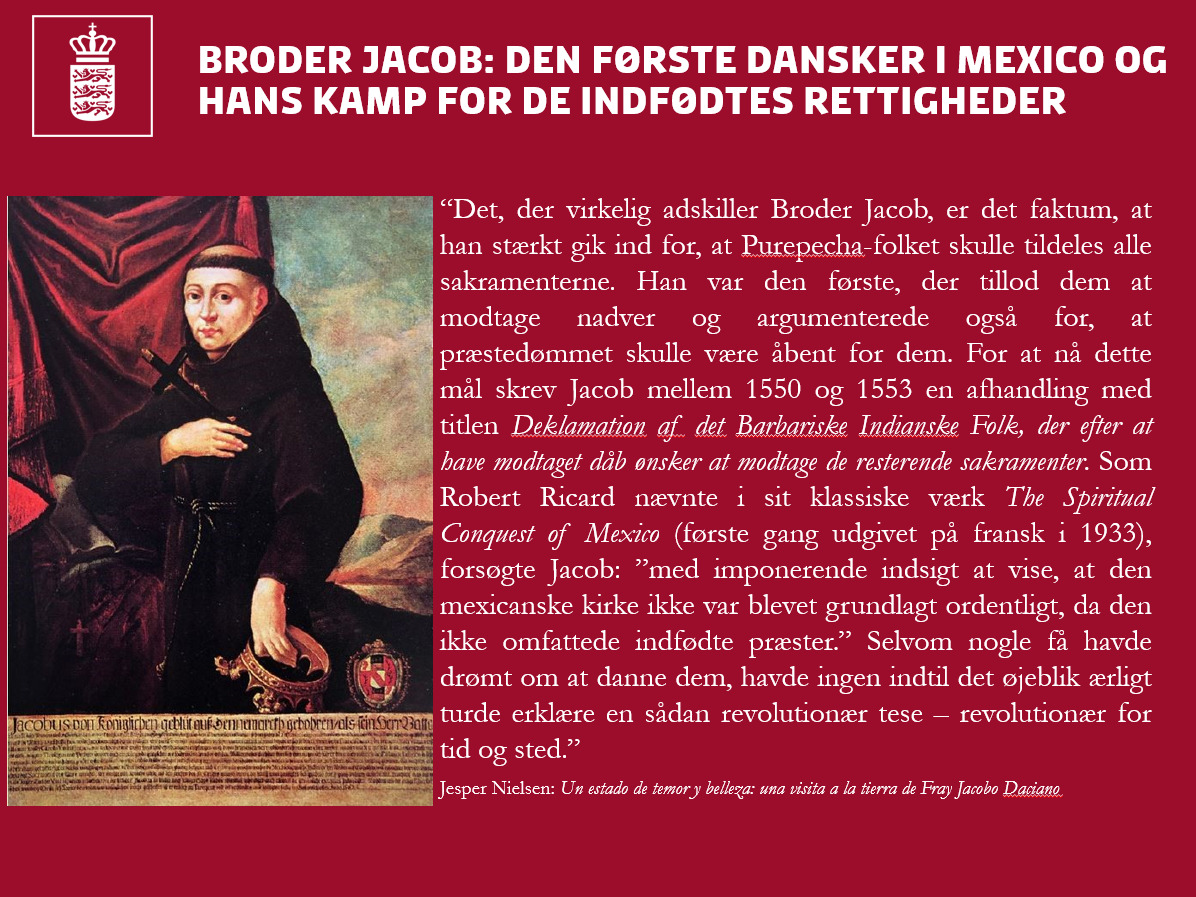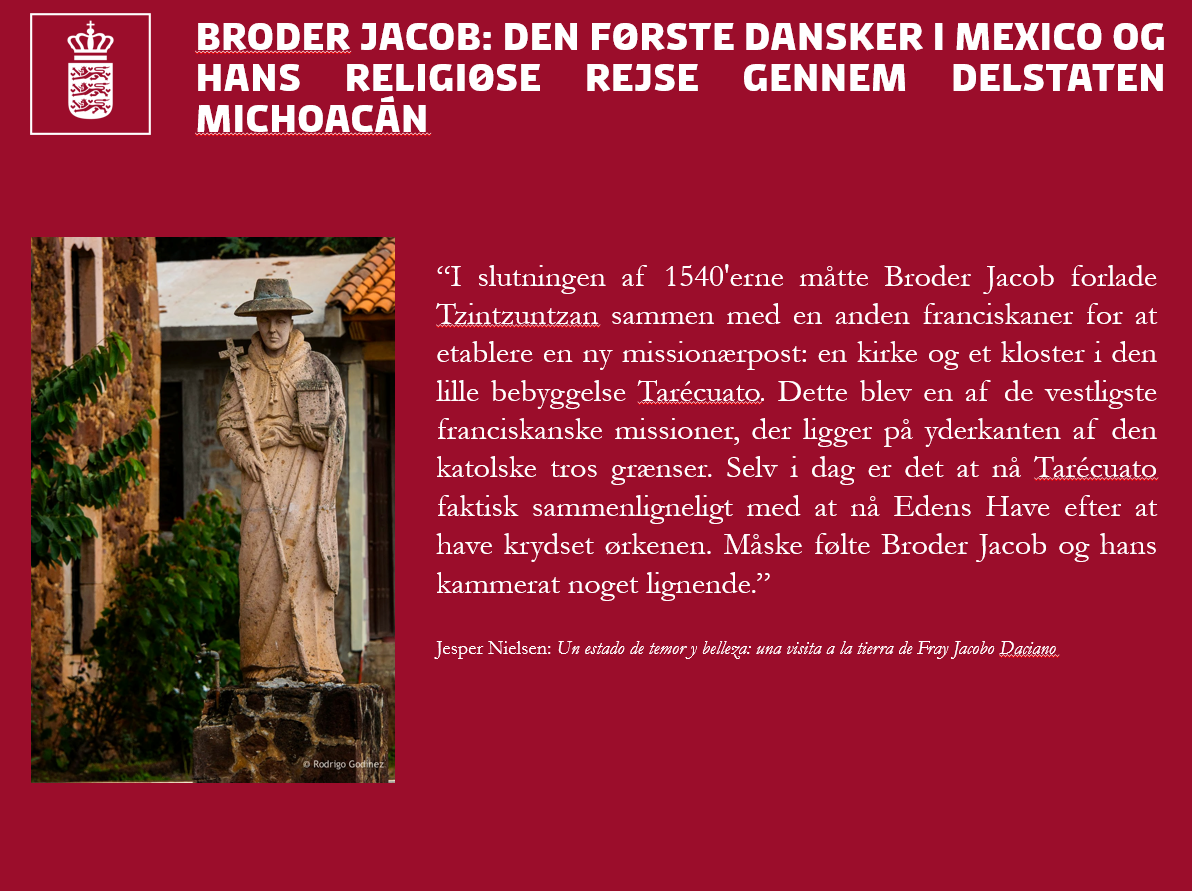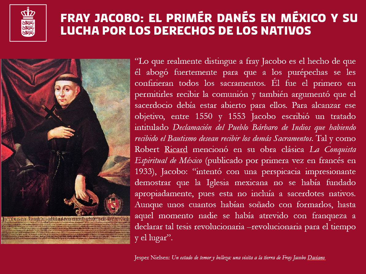 Fray Jacobo ha sido el primer símbolo de esta relación intercultural, y estamos emocionados de invitar a nuestros amigos tanto mexicanos como daneses a una presentación muy interesante de Jesper Nielsen, Profesor de Lenguas y Culturas Indígenas de América en la Universidad de Copenhague, sobre el primer danés en Mexico, cuyos ideas y su lucha por los derechos de los indígenas en la iglesia se pueden considerar revolucionarias según los estándares del siglo XVI.