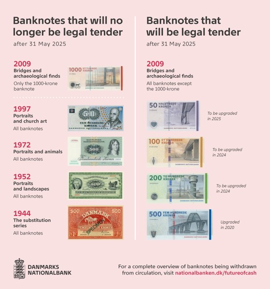 Alle ældre danske pengesedler og den nuværende 1000-kroneseddel vil blive ugyldige efter 31. maj 2025.