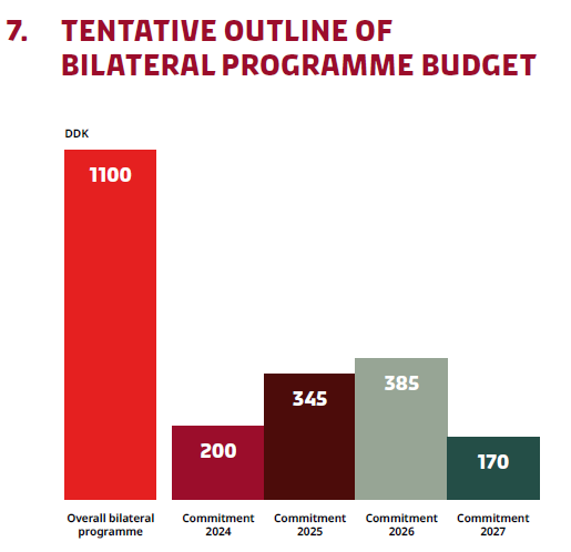 The current bilateral development programme for the period 2024-2028 has a total budget of DKK 1.1 billion covering eight projects and an adaptability reserve. The tentative outline of the budget across the four years is illustrated in graphic below.