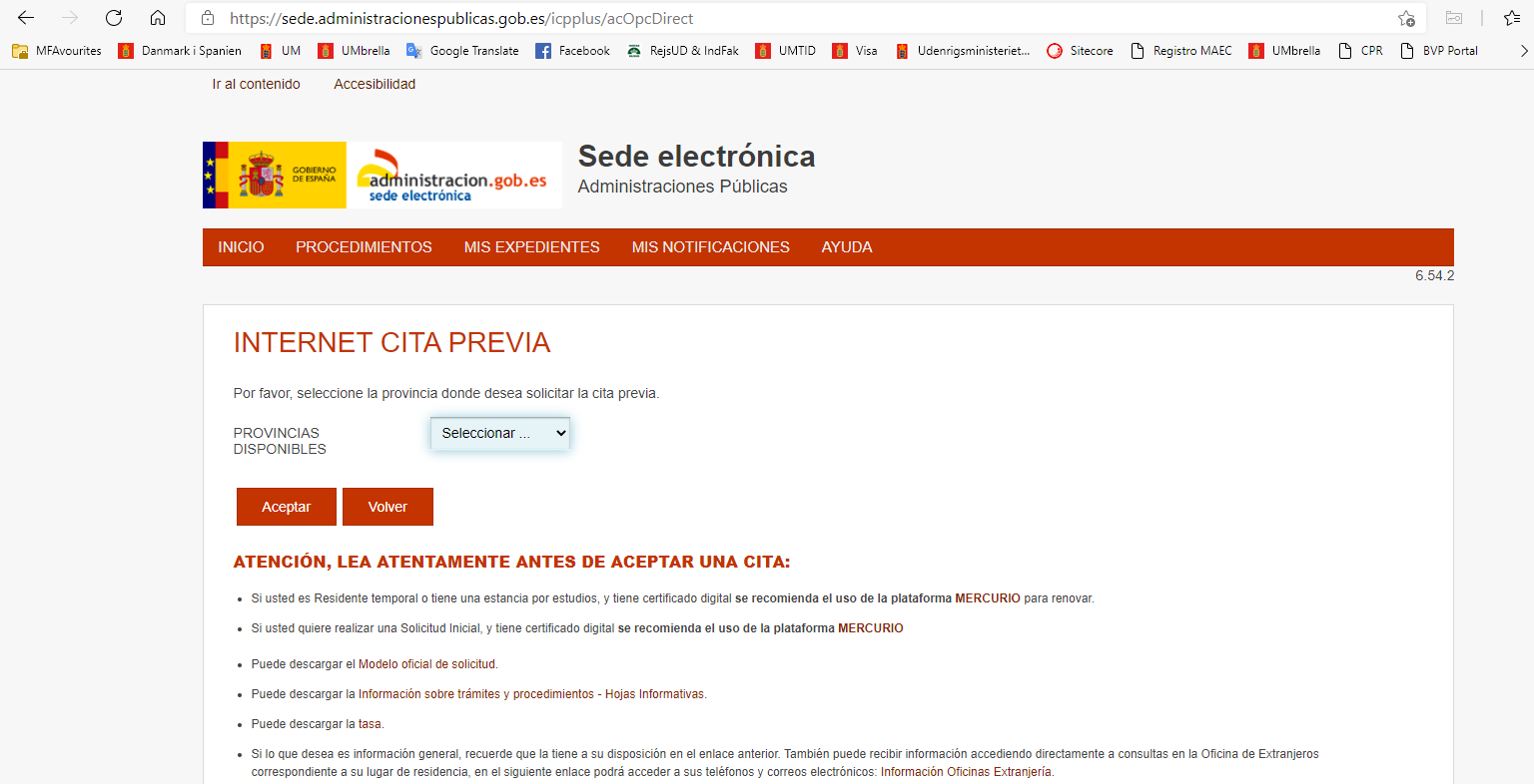 For at få opholdstilladelse skal du bruge følgende link til at bestille tid i forvejen. Når du kommer ind på forsiden, vælger du region, f.eks Zaragoza. Derefter skal du klikke på "Aceptar". Se billedet nedenfor: