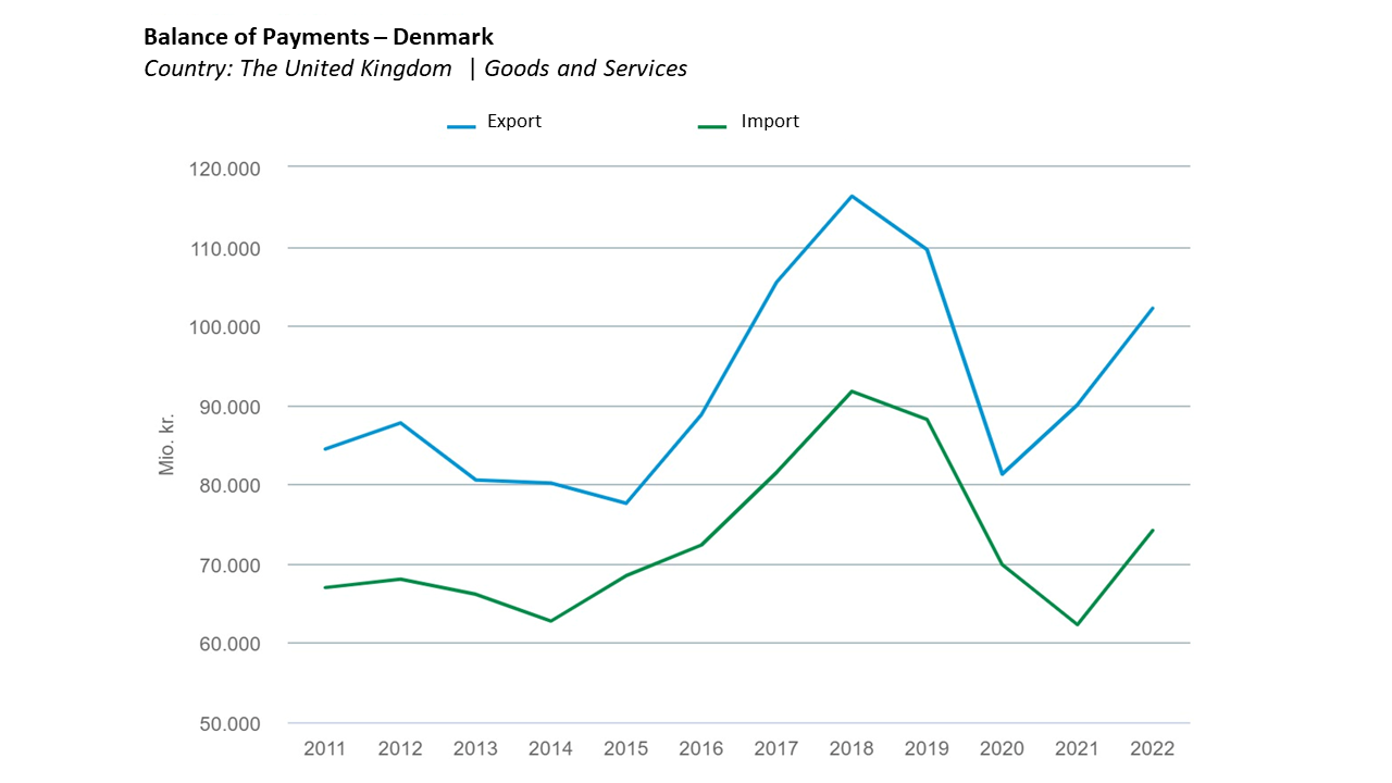 The UK was Denmark's 4th largest export market in 2021, totalling DKK 89.1 billion in revenues which accounted for 6,0% of Danish exports.