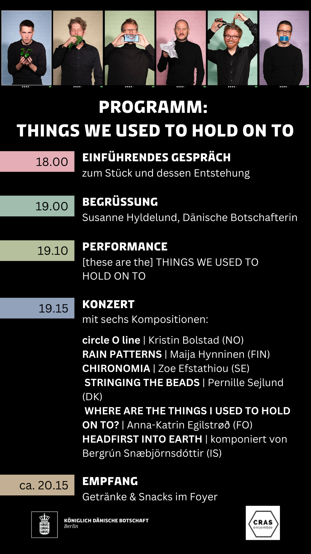 Das Ergebnis ist ein gemeinsames nordisches Konzert, das mit einem Gespräch über das Stück und den Prozess sowie einer vom CRAS Ensemble kreierten Performance mit dem Titel [these are the] THINGS WE USED TO HOLD ON TO eröffnet wird. Als natürliche Erweiterung der Gesamtidee des Projekts lädt diese Aufführung das Publikum ein, sich in die Gedanken der Gitarristen hineinzuversetzen, bevor alle Einzelteile zu einem gemeinsamen musikalischen Ausdruck zusammengebracht werden.