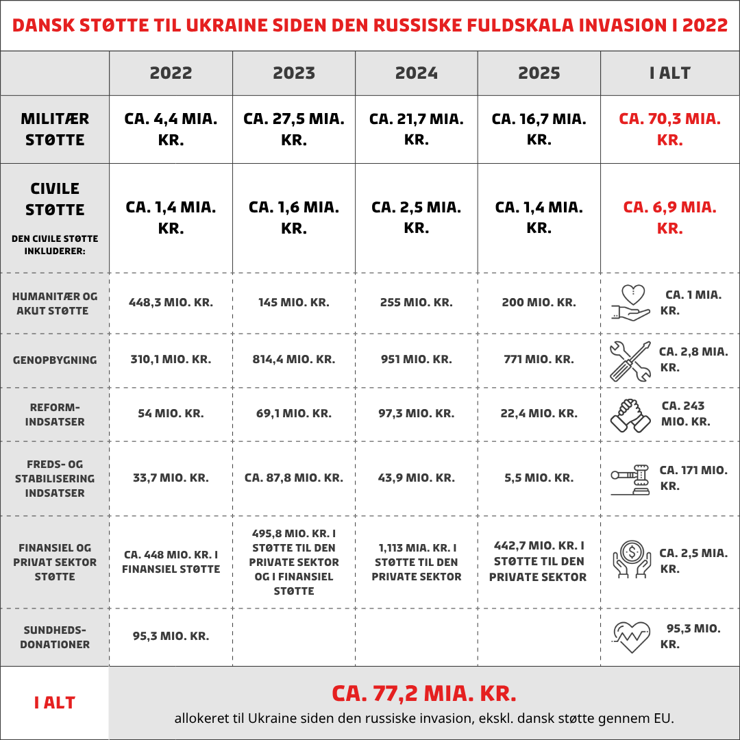 Danmark udviser solidaritet med Ukraine gennem den bredspektrede og langsigtede støtte, som vi har ydet bilateralt, multilateralt og i samarbejde med partnere og allierede i EU og NATO. Siden krigens udbrud er den bilaterale støtte til Ukraine nået op på ca. 70,3 mia. kr. i militær støtte og ca. 6,9 mia. kr. i civil støtte. Den civile støtte udgøres af ca. 4,7 mia. kr. i bevillinger, ca. 2,2 mia. kr. til garantistilling og garantiordning. Den samlede støtte er ekskl. bidrag gennem EU.