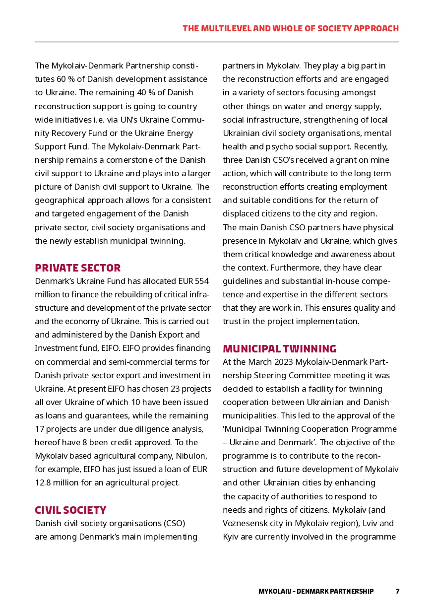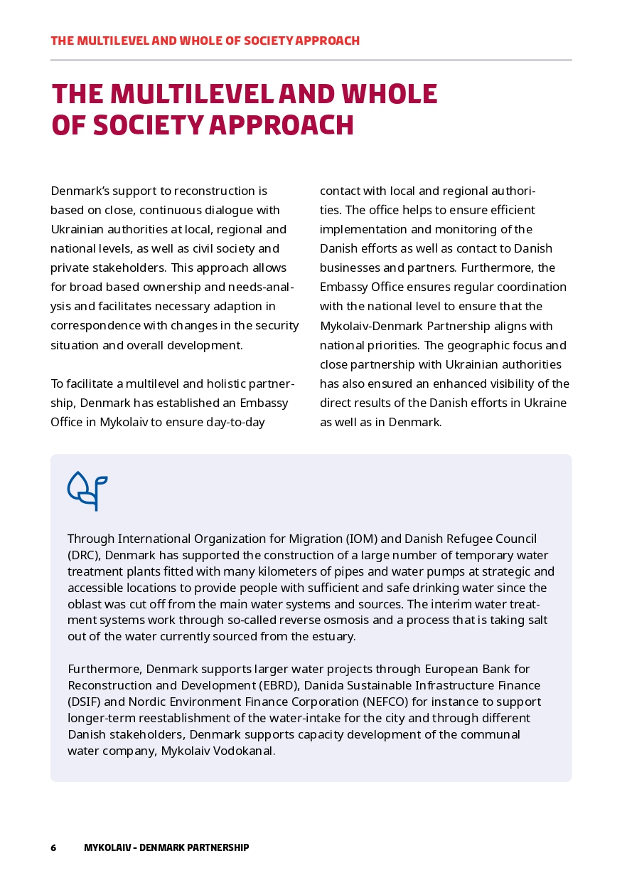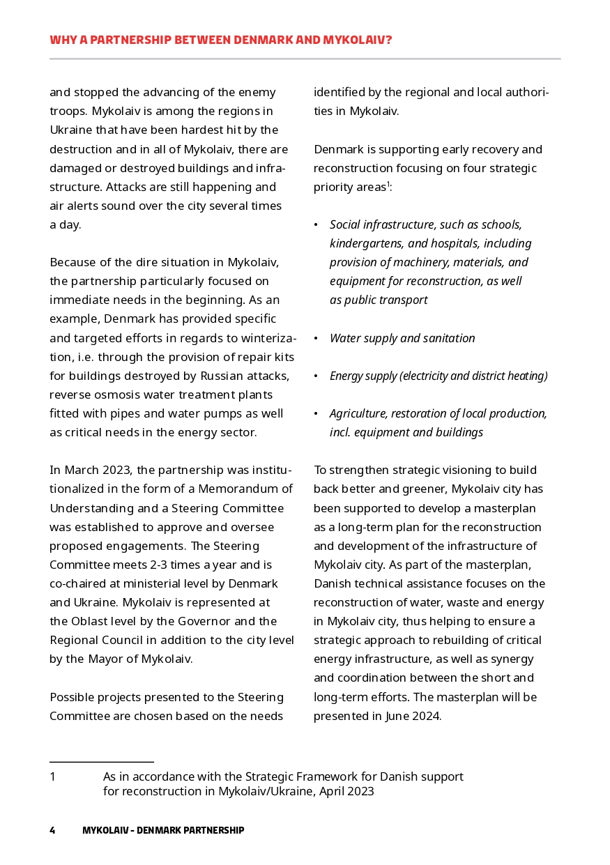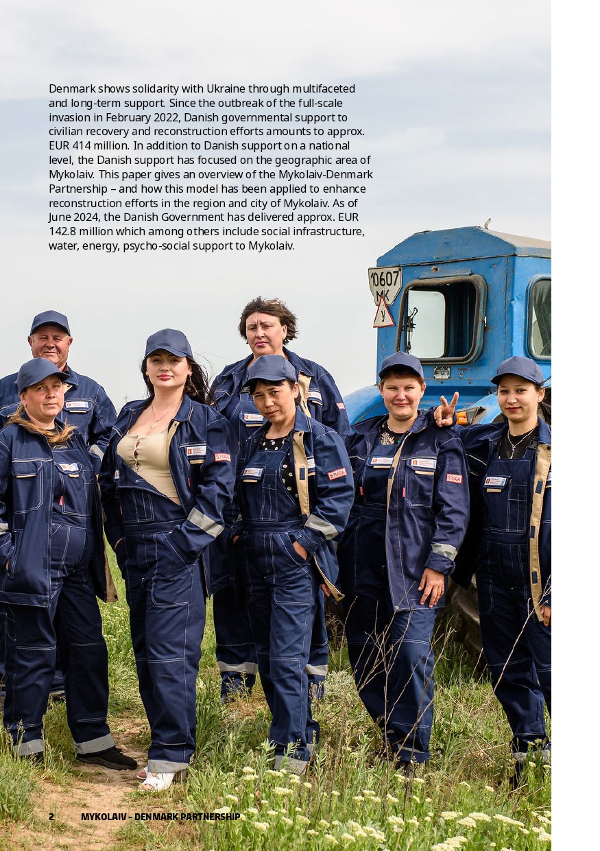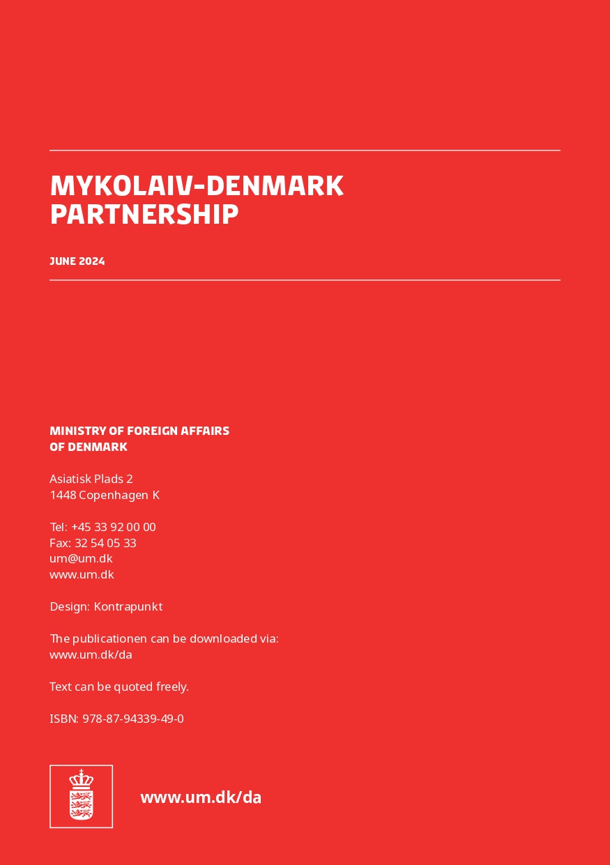 In parallel with Danish support on a national level, Denmark’s support for Ukraine’s reconstruction has a specific focus on Mykolaiv city and region. This paper gives an overview of the Mykolaiv-Denmark Partnership and how this model is applied locally. As of June 2024, the Danish Government has delivered approx. EUR 142.8 million which includes social infrastructure, water, energy, psycho-social support and much more.
