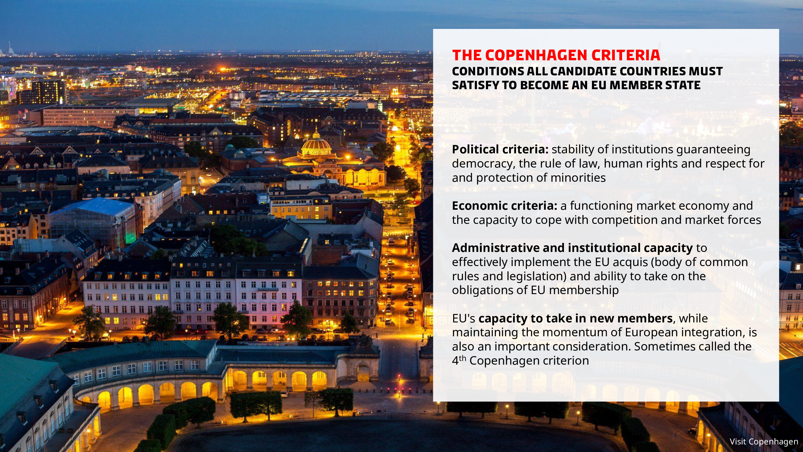 The Copenhagen Criteria for EU-membership were adopted in Copenhagen on 21-22 June 1993 by the European Council. These criteria define a broad set of rules spanning from democracy, rule of law and human rights, to market economy and the ability of countries to effectively implement the EU acquis.