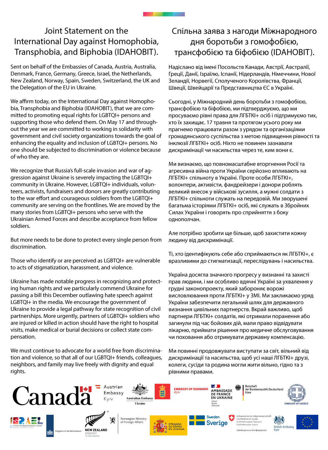 Today, the Embassy is flying the rainbow flag. The Ambassador has had a meeting with representatives of Ukraine’s LGBTQI+ organizations who shared their thoughts on the current situation pertaining to their rights in Ukraine.