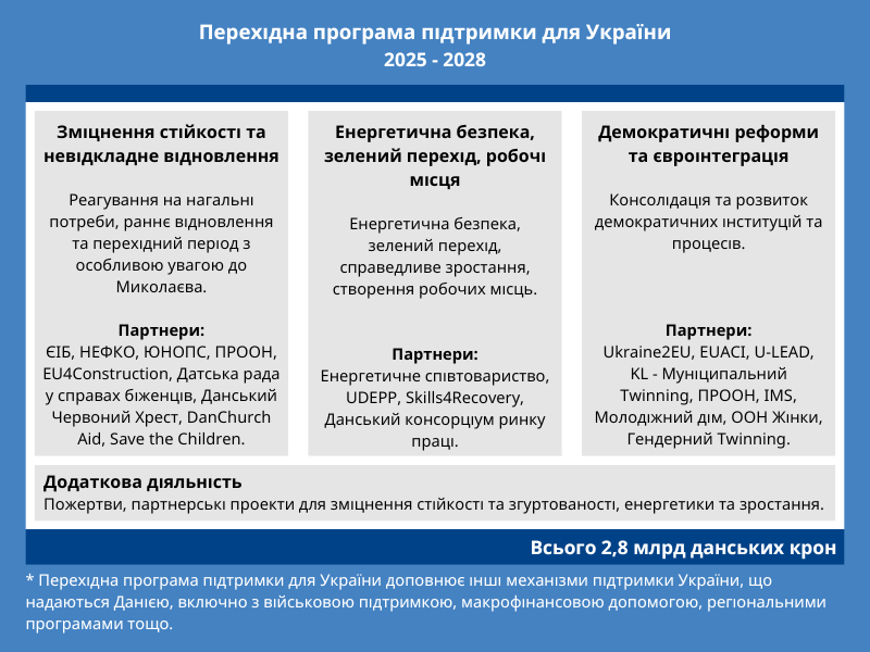 Перехідна програма підтримки для України – це програма, що триватиме до 2028 року та підтримуватиме як невідкладне відновлення, так і довгострокову реконструкцію. Програма була розроблена у тісному діалозі з українською владою та місцевими органами влади, а також громадянським суспільством в Україні та Данії.