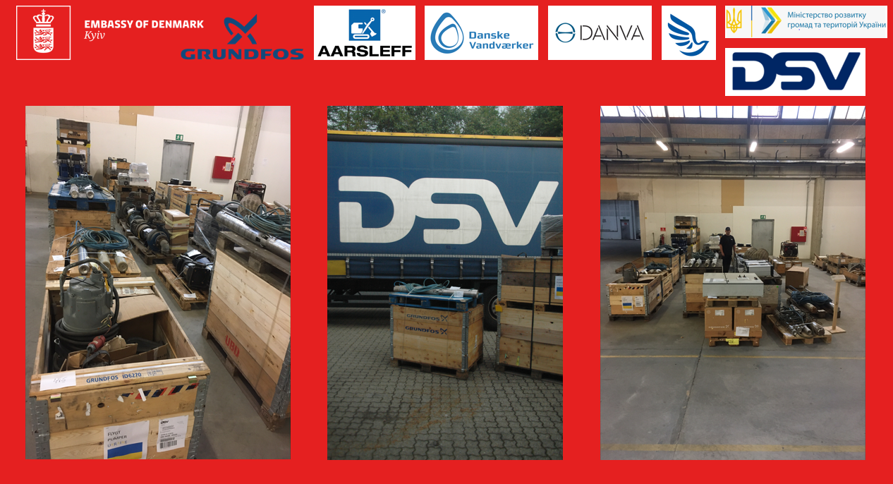 Серед обладнання – вертикальні багатоступеневі насоси, занурювальні насоси, відцентрові та дренажні насоси, а також різноманітні аксесуари, зокрема частотні перетворювачі, зварювальні апарати тощо. Це стало можливим завдяки унікальному державно-приватному партнерству, яке складається з Посольства Данії, Асоціації водних комунальних компаній в Данії «Danske Vandværker» і «DANVA», а також трьох данських компаній: Grundfos, світовий лідер у галузі насосів, і Per Aarsleff, одна з головних будівельних компаній Європи, DSV Logistics – світовий лідер у сфері логістики та вантажних перевезень. Кожна з компаній має значний досвід в Україні.