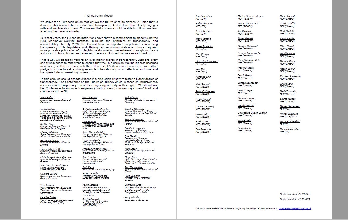 As of 21 October 2021, all European Union Member States, 50 Members of the European Parliament, the European Commission and the European Ombudsman have joined the Transparency Pledge.